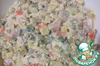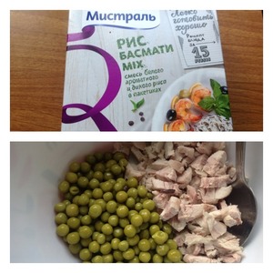 В салатник выложить горошек, и порезанную на кубики куриную грудку. -