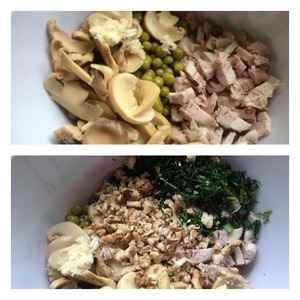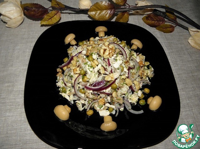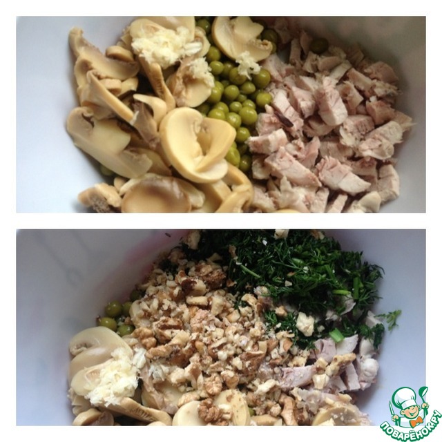 Вкусный и простой в исполнении салат с куриным филе, шампиньонами и орехами.