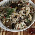 [+5]делала из свежемороженного горошка ,отваренного в микро, и из консервированного асорти из лесных грибов.укроп был тоже свежемороженный.