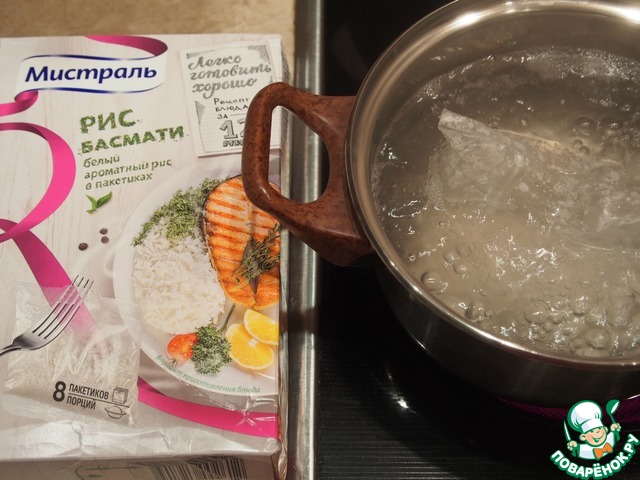 Налить в кастрюльку воду, добавить соль (1/2 ч. л.), поставить на огонь и довести до кипения. Пакетик с рисом Басмати положить в кипящую воду и варить 12 минут.