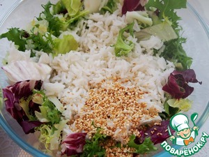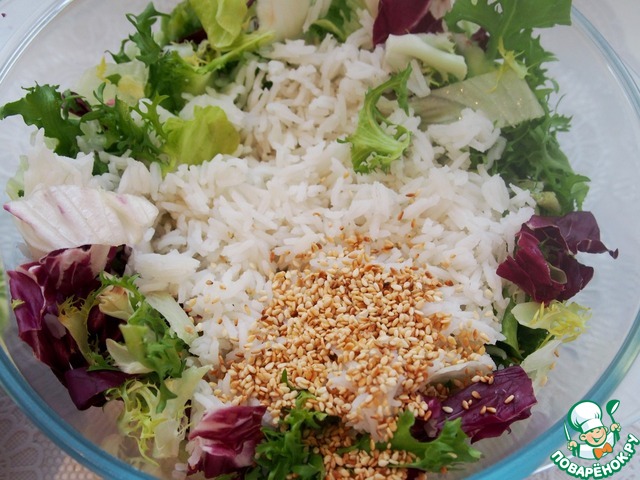 Тем временем рис сварился. Извлечь его из пакетика. Смешать листья салата, рис и оставшийся кунжут.