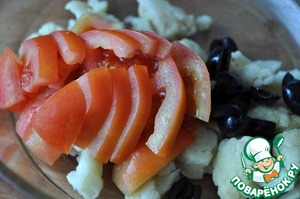 Добавляем к капусте нарезанный на дольки помидор и на половинки маслины.