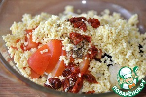 Добавляем пшено к овощам, заливаем заправкой, перемешиваем.