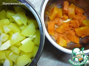 Слить воду с тыквы и картофеля.