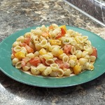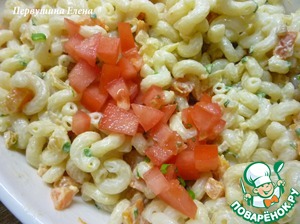 нарезать кубиками помидор. Размешать, чтобы распределить соус равномерно по всем макаронам.