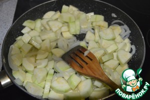 Затем всыпать кабачок и измельченный чеснок. Готовить минут 6-8, посолить, поперчить. Дать немного остыть