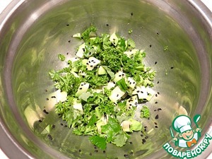 В миске соединяю авокадо, петрушку, мелиссу, черный кунжут. Аккуратно перемешиваю ингредиенты.