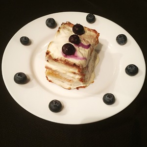Творог смешиваем с сахзамом и ванилином, смазываем каждый корж творогом, сверху выкладываем голубику. Ставим в духовку еще минут на 10. -
