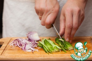 Тонкими полосками порежьте перцы. Кунжут и арахис (если необходимо) поджарьте на сковороде.