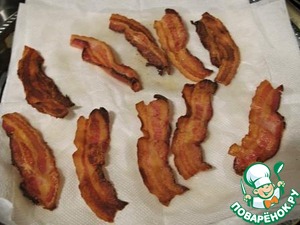 Бекон обжарить до хрустящей или мягкой корочки (как вам больше нравится) и выложить на бумажные полотенца.