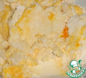 Приготовим тесто. Для этого смешиваем творог с порубленным размягченным сливочным маслом. Хорошо перемешиваем. Затем добавляем яйцо. -