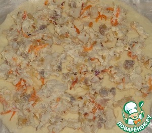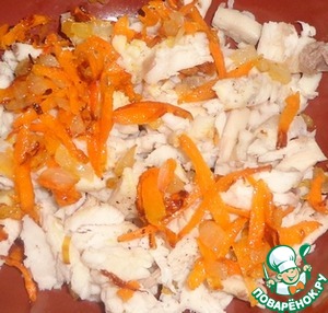 Морковь натереть на крупной терке, лук мелко нарезать. Обжарить лук и морковь на растительном масле 1-2 минуты. Рыбное филе остудить и нарезать на кубики. Добавить морковь с луком в рыбное филе.