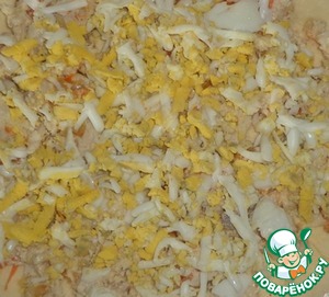 Затем выкладываем сверху слой из отварного яйца (натереть на крупной терке) и снова посыпаем сыром (тоже на крупной терке).