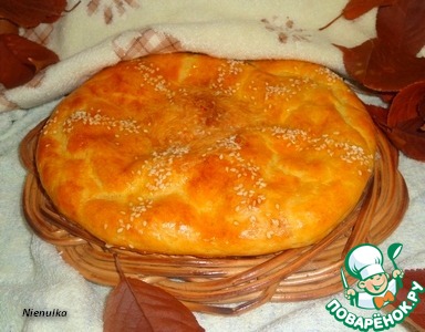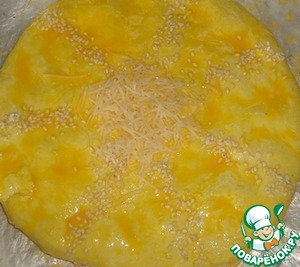 В середину пирога кладем немного твердого сыра (натереть на мелкой терке). Посыпаем кунжутом.