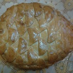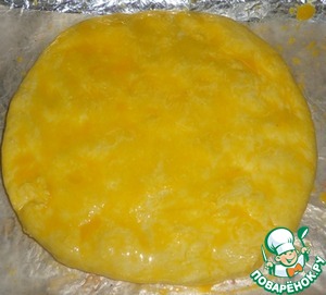 Накрываем начинку второй лепешкой, подгибаем края лепешки под низ. Смазываем пирог яичным желтком.