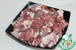 Мясо, у меня баранина режем средними кусочками. Можно использовать любое мясо, вкус этого блюда именно в соусе, но традиционно это баранина.