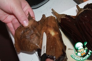 Баклажаны моем и сушим. Если у вас баклажаны маленькие, то берем на 1 шт. больше. Отправляем их в духовку разогретую до 200 гр. до мягкого состояния, у меня на это ушло 15 мин. После этого наши баклажаны остужаем. Можно вымочить их в соленой воде или воде с лимоном, чтобы убрать горечь. Но, сейчас баклажаны импортные и они практически не горчат, так что я этого не делала.