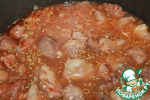 После этого к мясу добавляем воду, она должна немного покрывать мясо. Добавляем к мясу розмарин и перец. Тушим в течение 1, 5 - 2 часов, до мягкости мяса. Я делала это в мультиварке, очень нравится мне режим тушения.