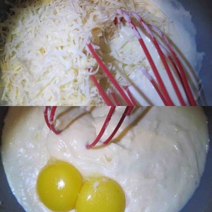 Высыпаем в молочную смесь натёртый сыр и мешаем, пока сыр не растворится. После этого снимаем сотейник с огня и вмешиваем в смесь два желтка.