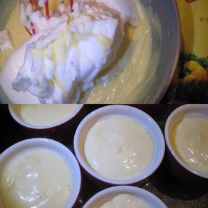 Белки взбиваем в устойчивую пену и аккуратно вмешиваем их в горячую смесь. Разливаем смесь в формочки, но не до краёв- суфле при выпечке поднимется. Формочки ставим в противень, который наполним водой на 2/3 высоты формочек. Выпекаем суфле в разогретой духовке 20-25 минут или до зарумянивания.