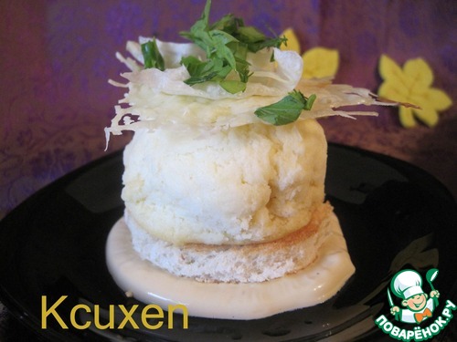 Воздушное суфле, коронованное чипсой из пармезана, на пшеничном сухарике, как на лодочке плывёт на волнах пикантного соуса.
