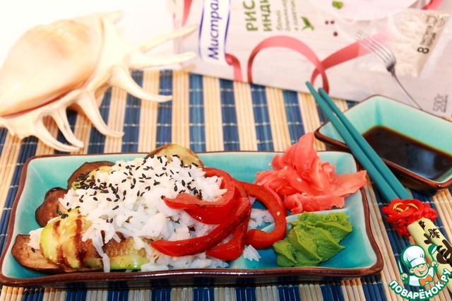 • Девочка в ресторане отеля нам просто накидывала в тарелку слоями: баклажаны, рис, цуккини. рис, перчик, рис. Сбрызнула кунжутным маслом, присыпала чуток хлопьями перца чили и посыпала кунжутом.