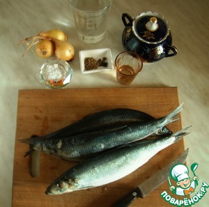 Для приготовления рольмопсов из свежемороженной сельди соберем необходимые приправы и рыбу.