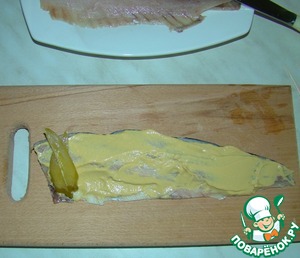 Обмажем горчицей филе и положим огурчик на широкий край филе.