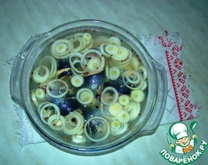 Приготовим маринад из воды, соли, сахара и приправ. Дадим прокипеть 3 минуты, выключим и добавим уксус. Охладим маринад до теплого состояния и заливаем им подготовленные рольмопсы с луком.