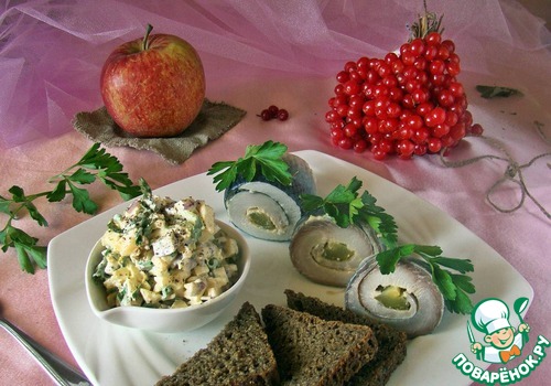Предлагаю Вашему вниманию очень легкий и свежий салатик к рольмопсам + сам рецепт приготовления рольмопсов! Рольмопс - блюдо северогерманской кухни, распространено также в кухнях народов Балтики: датчан, шведов, латышей, эстонцев, финнов. Роль-мопс (рольмопс) — маринованная сельдь, скрученная в рулетики. Рулоны скрепляются деревянными палочками. Внутрь добавляют корнишон или лук.