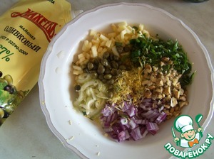 Соединить все в одном салатнике, добавить орехи, цедру и каперсы.