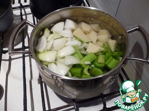 Моем овощи, чистим картофель и лук, режем на небольшие кусочки, заливаем водой и ставим на средний огонь.