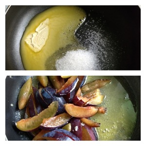 В сковороду выложить маргарин и сахар, когда маргарин растопился добавить сливы. При постоянном помешивании карамелизовать сливы 5 мин на средне-слабом огне.