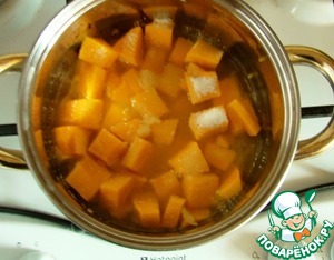 В сотейник отправляем нарезанную средними кубиками тыкву, добавляем сок одного апельсина и половины лимона. Засыпаем сахаром и тушим на медленном огне до мягкости тыквы. У меня для этого потребовалось 25 минут.
