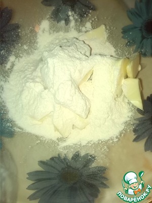 Растереть маргарин с мукой, солью. Добавлять муку постепенно, сколько потребуется для крошки.