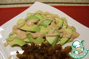 Предлагаю еще один салат на тему авокадо и креветок. Салат вкусный, и делает его таковым обжарка панированных креветок и замечательный соус, часто подаваемый к креветкам. Право первенства в изобретении соуса "Мари - Роз" (Marie - Rose), принадлежит британскому повару Фанни Крэдок. Основа соуса майонез, в данном варианте Махеевъ провансаль с лимонным соком.