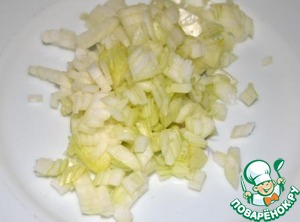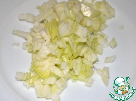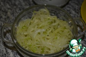 Лук нарезать, залить на несколько секунд кипятком, воду слить.