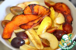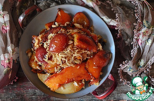 Сверху выложить тыкву и фрукты в сиропе. Перемешать, аккуратно поднимая рис с тарелки, стараясь не поломать форму карамелизированных фруктов.