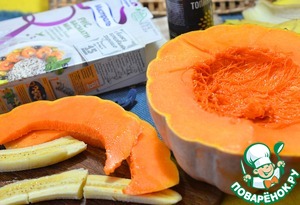 Тыкву нарезать крупными, но тонкими кусками. Такая нарезка лучше всего для идеального впитывания сиропа с маслом. Рис Басмати Микс положить в кипящую подсоленную воду. Закрыть крышкой. Рис от Мистраль варится 15 минут. Банан нарезать по всей длине на крупные куски.