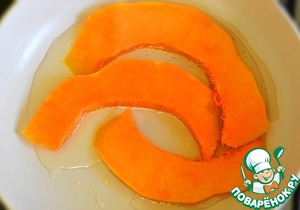 Тыкву обжарить в растительном масле с двух сторoн, по 2 минуты на каждой.