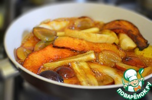Когда тыква обжарится добавить к ней фрукты: банан, нарезанную на крупные куски грушу и сливы.
