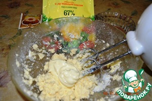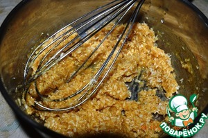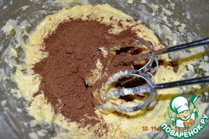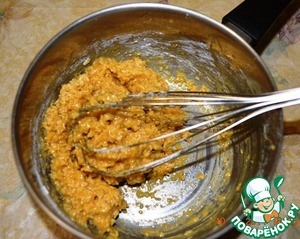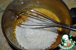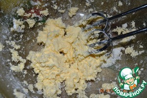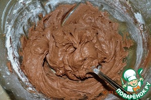 В муку добавить разрыхлитель и перемешать. Половину сухой смеси выложить в масляную и ложкой перемешать.