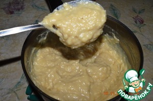 Все хорошенько вымешать и поставить на маленький огонь вариться до загустения (смесь постоянно мешать!). Вот такая густая масса должна получиться. Начинку выставить на холод остывать.