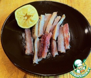 Филе сельди нарезать брусочками и полить лимонным соком. В принципе, Вы можете взять любую копчёную рыбу, например, салаку или скумбрию.