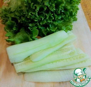 Листья салата промыть и обсушить бумажным полотенцем. Огурец очистить от кожицы и нарезать тонкими ломтиками.