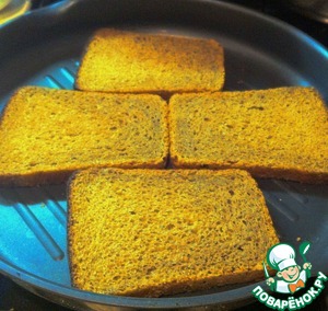 Ломтики хлеба подсушить на сухой раскалённой сковороде с одной стороны.