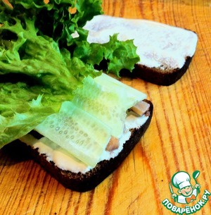 Смазать хлеб соусом с неподжаренной стороны. На два ломтика выложить рыбу, ломтики огурца и салатные листья.