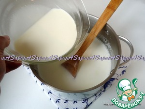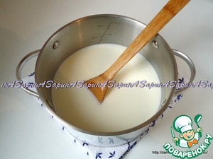 Для крема: 500 мл молока смешать со сгущенным молоком в кастрюльке, поставить на огонь и сварить сироп.