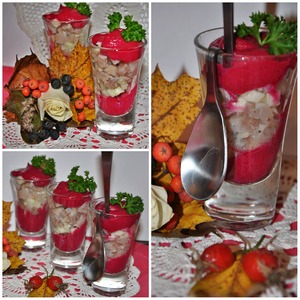 Сельдь со свекольным муссом это красивое, вкусное и оригинальное блюдо, на приготовление которого уйдет не больше 20 минут. Условие одно – в холодильнике должна быть отварная свекла.