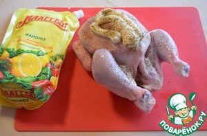 Цыпленка хорошо вымыть, обсушить полотенцем, выложить на него майонез, хмели-сунели, соль, равномерно обмазать со всех сторон и внутри. Оставить цыпленка на 1 час при комнатной температуре.